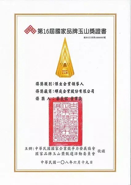 The National Brand Yushan Award selects the most competitive corporate models to encourage Taiwanese companies to work hard and commit to building a national brand image. Because of localization management with quality product design and active establishment of fully automatic process and management for more than 30 years, Huei Tyng group won two awards " Outstanding Business Leaders Award” and “Outstanding Enterprise Award”.